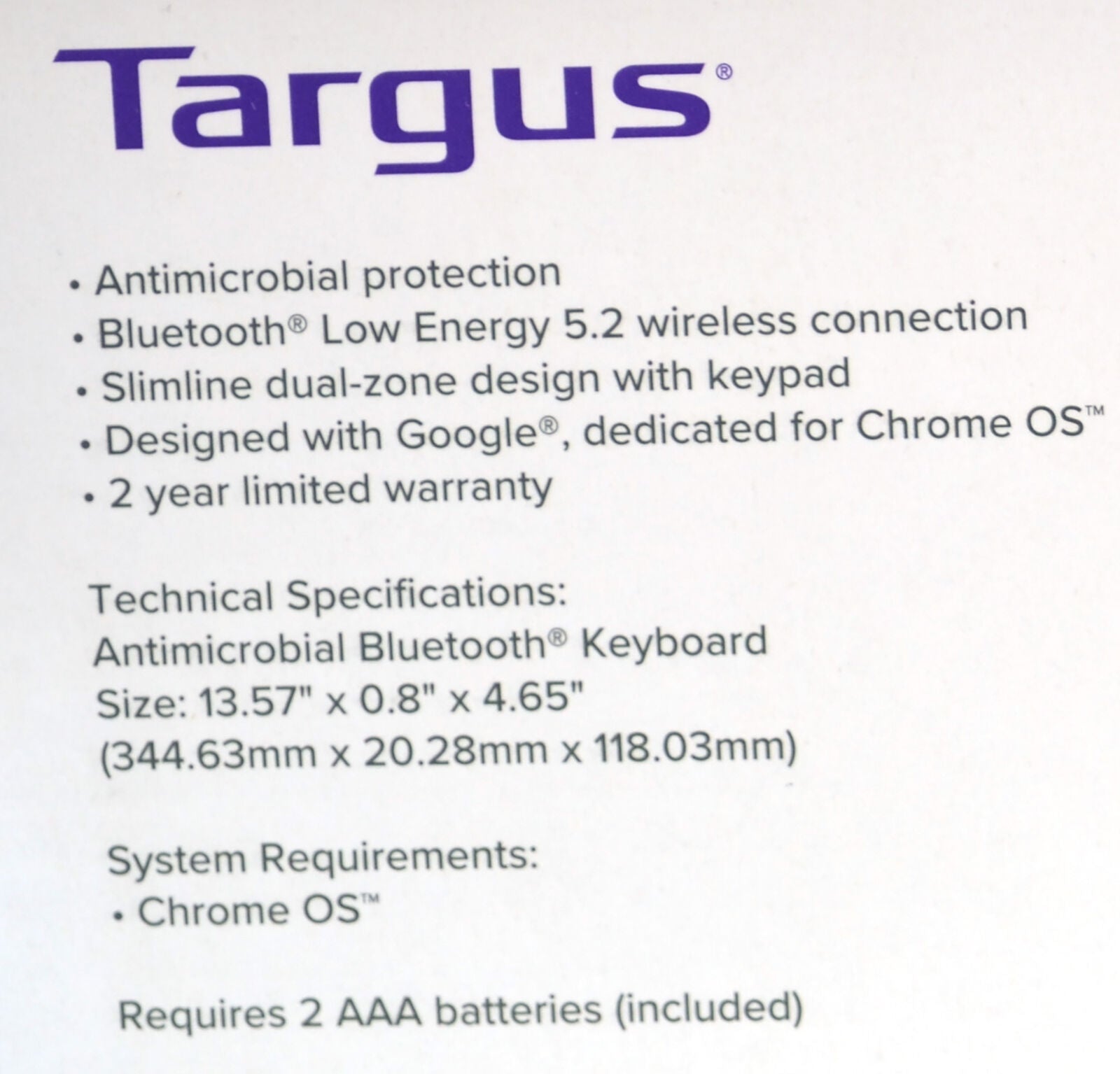Work from anywhere with the Targus® Works With Chromebook™ Bluetooth® Antimicrobial Keyboard. This slimline keyboard has a lightweight design for easy carrying alongside your Chromebook™ laptop and other workspace essentials. No need to worry about tangled wires or connection disruptions, this keyboard uses reliable and power-saving Bluetooth® Low Energy 5.2 wireless technology. Plus, it was engineered for Chrome OS™ compatibility so you can work seamlessly with your Chromebook™.