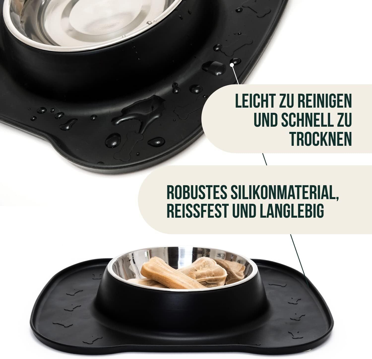 The silicon surround with raised lip, catches those splashes and drips your thirsty pet leaves around as they quench their thirst or hunger!