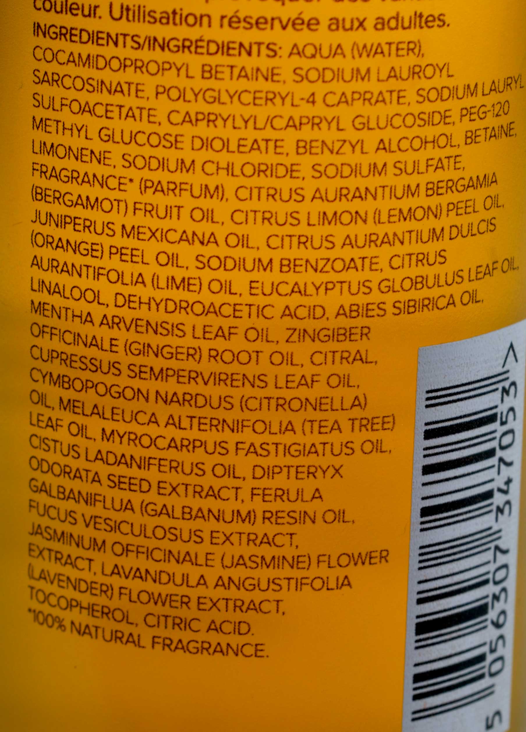 Aqua/Water/Eau, Cocamidopropyl Betaine, Sodium Lauroyl Sarcosinate, Polyglyceryl-4 Caprate, Sodium Lauryl Sulfoacetate, Caprylyl/Capryl Glucoside, PEG-120 Methyl Glucose Dioleate, Benzyl Alcohol, Betaine, Limonene, Sodium Chloride, Sodium Sulfate, Fragrance* (Parfum), Citrus Aurantium Bergamia (Bergamot) Fruit Oil, Citrus Limon (Lemon) Peel Oil, Juniperus Mexicana Oil, Sodium Benzoate, Citrus Aurantium Dulcis (Orange) Peel Oil, Citrus Aurantifolia (Lime) Oil, Eucalyptus Globulus Leaf Oil, Linalool, Dehydroacetic Acid, Abies Sibirica Oil, Mentha Arvensis Leaf Oil, Zingiber Officinale (Ginger) Root Oil, Citral, Citric Acid, Cupressus Sempervirens Leaf Oil, Cymbopogon Nardus (Citronella) Oil, Melaleuca Alternifolia (Tea TREE) Leaf Oil, Myrocarpus Fastigiatus Oil, Cistus Ladaniferus Oil, Dipteryx Odorata Seed Extract, Ferula Galbaniflua (Galbanum) Resin Oil, Fucus Vesiculosus Extract, Jasminum Officinale (Jasmine) Flower Extract, Lavandula Angustifolia (Lavender) Flower Extract, Tocopherol, *100% Natural Fragrance