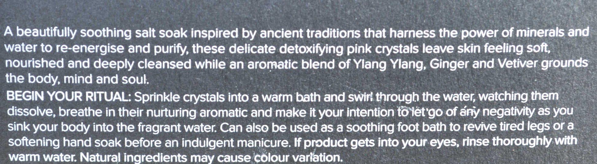 The delicate detoxifying pink crystals leave skin feeling soft nourished and deeply cleansed while an aromatic blend of ylang ylang ginger and vetiver grounds the body mind and soul.