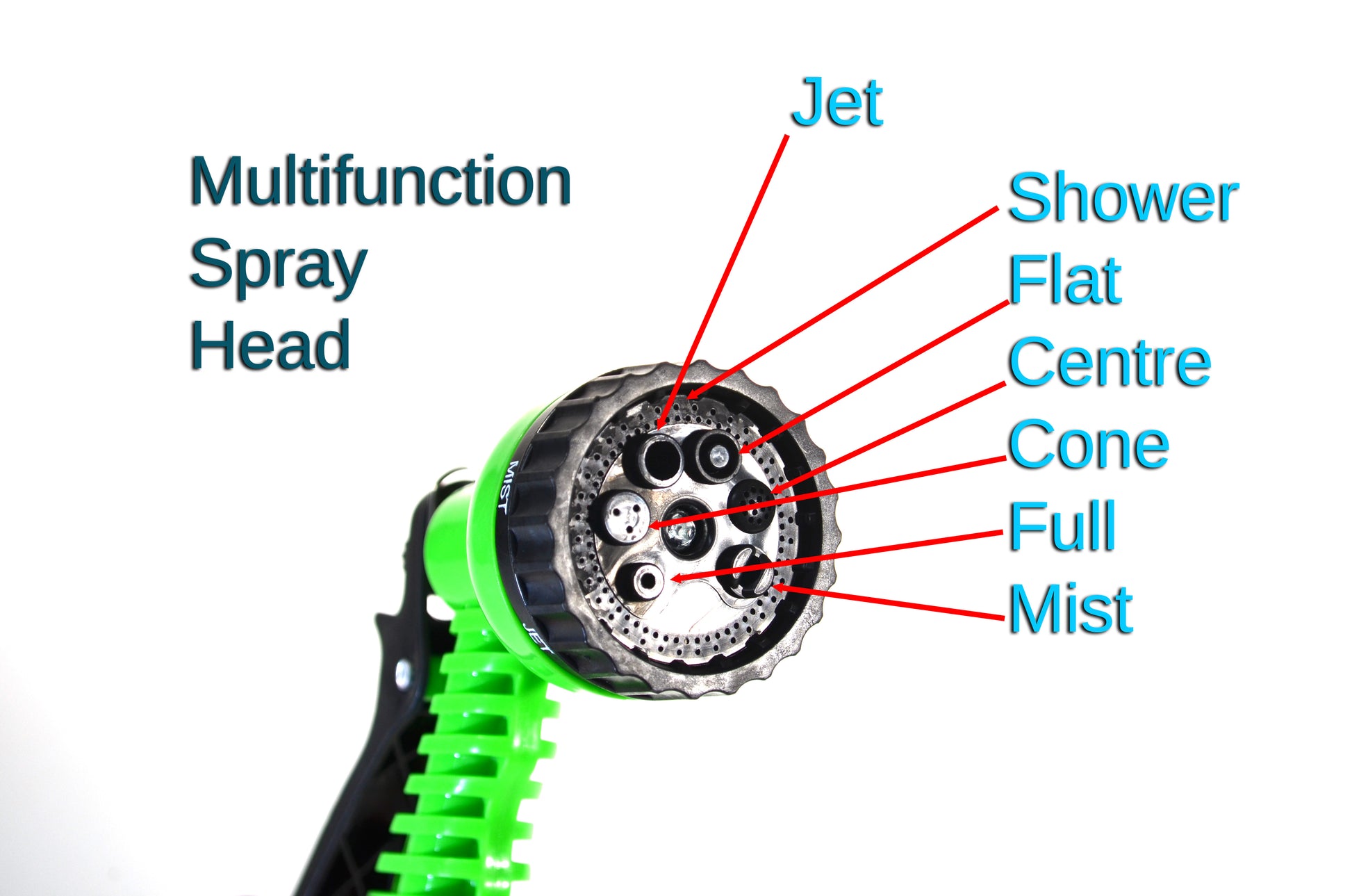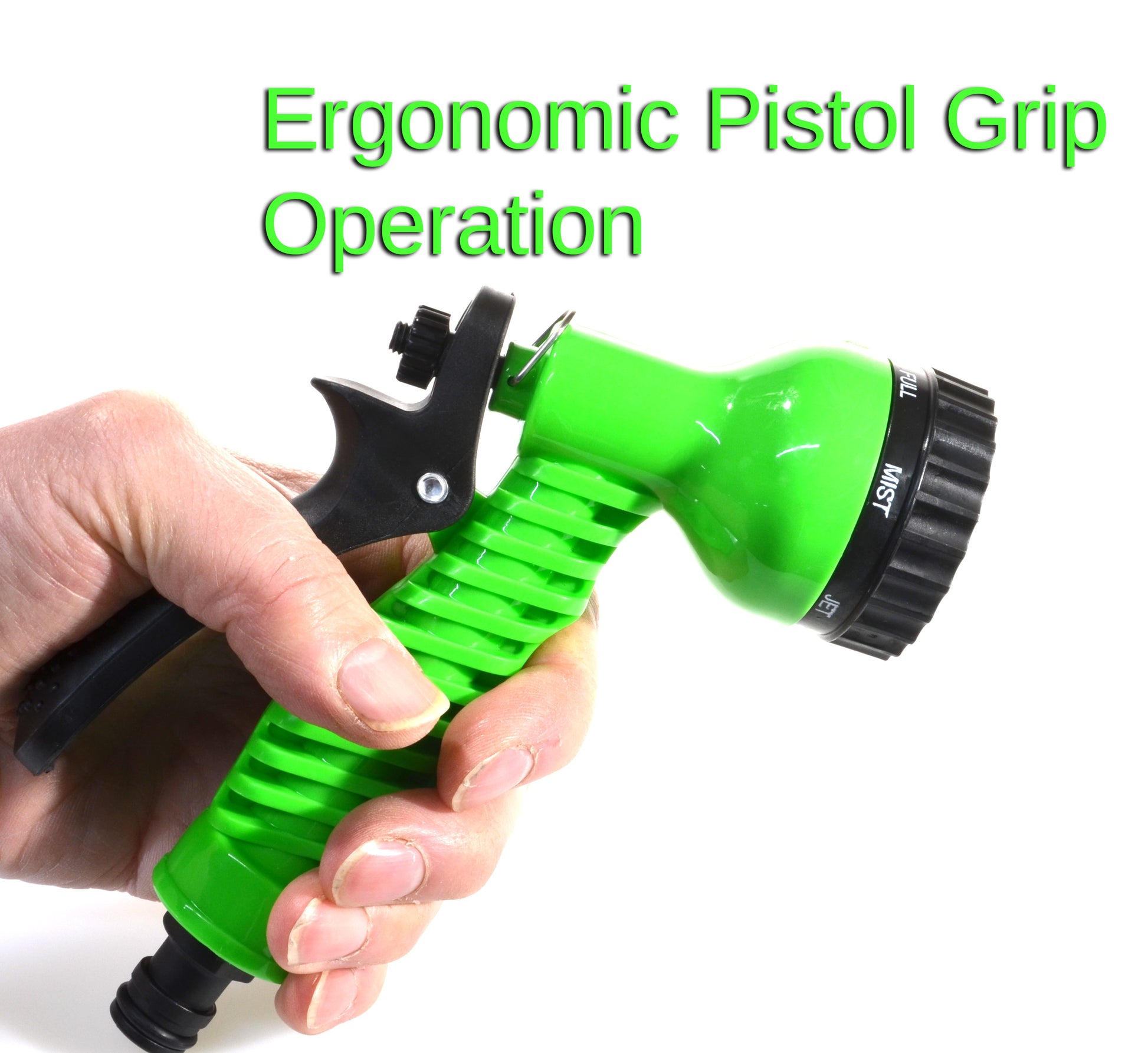 7-PATTERN MULTI-FUNCTION SPRAY NOZZLE Includes adjustable spray gun with 7 modes: Shower, Flat, Centre, Cone, Full, Mist, Jet and Shower – perfect for plants, lawns, patios, cars and more.