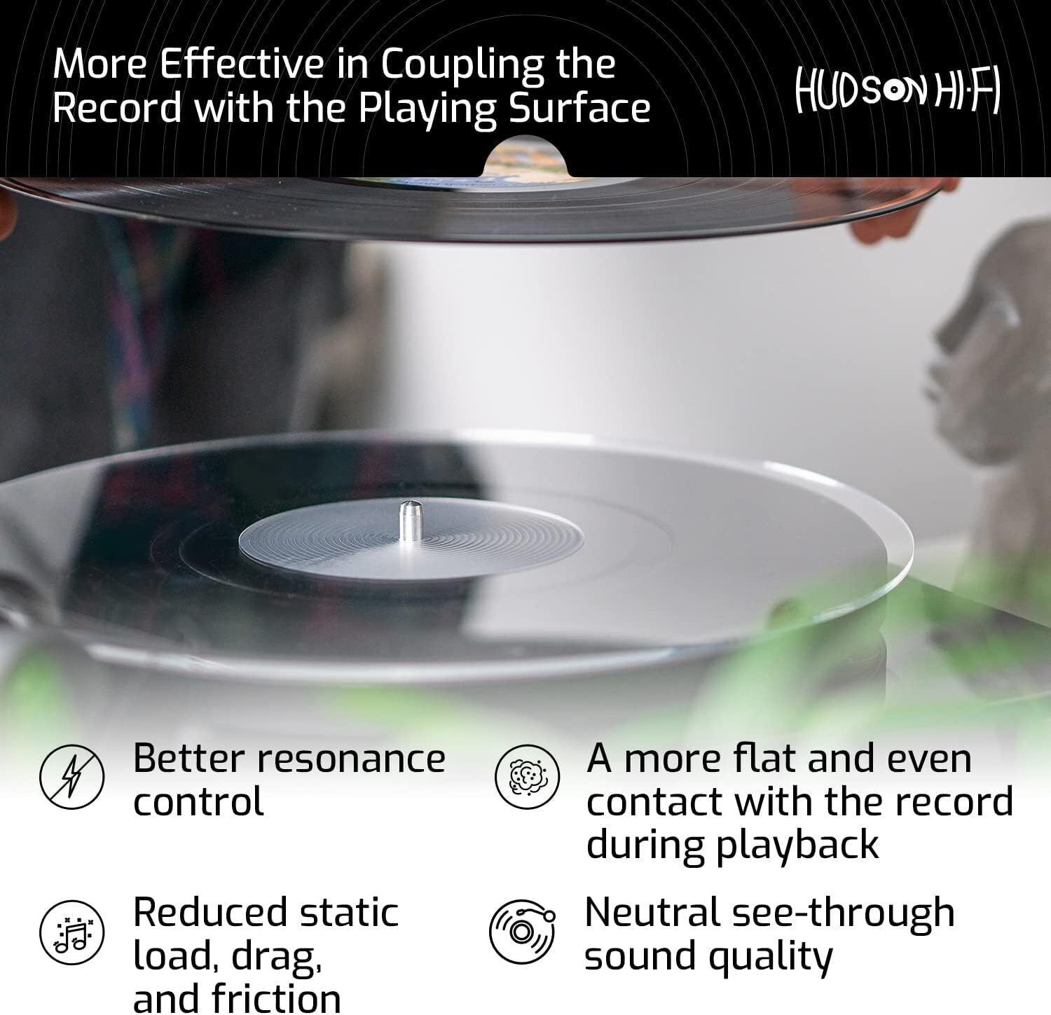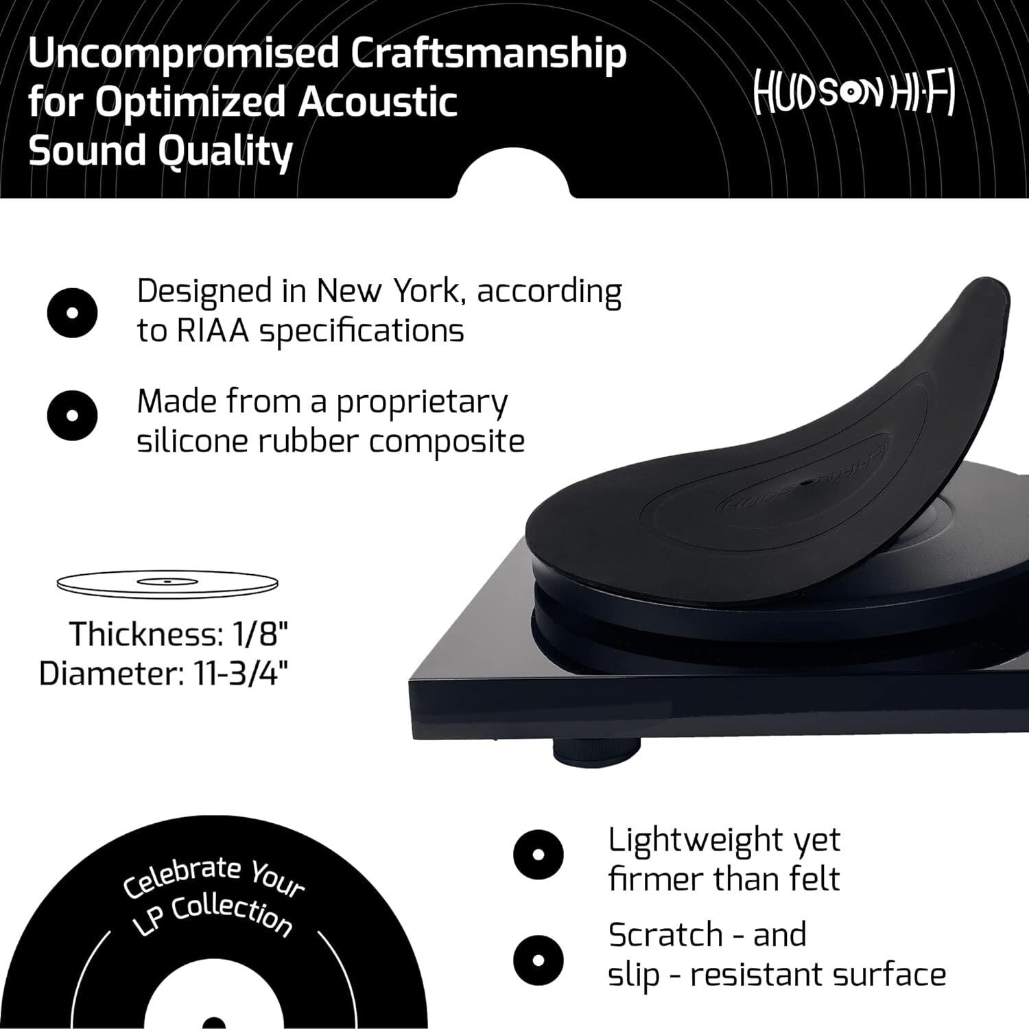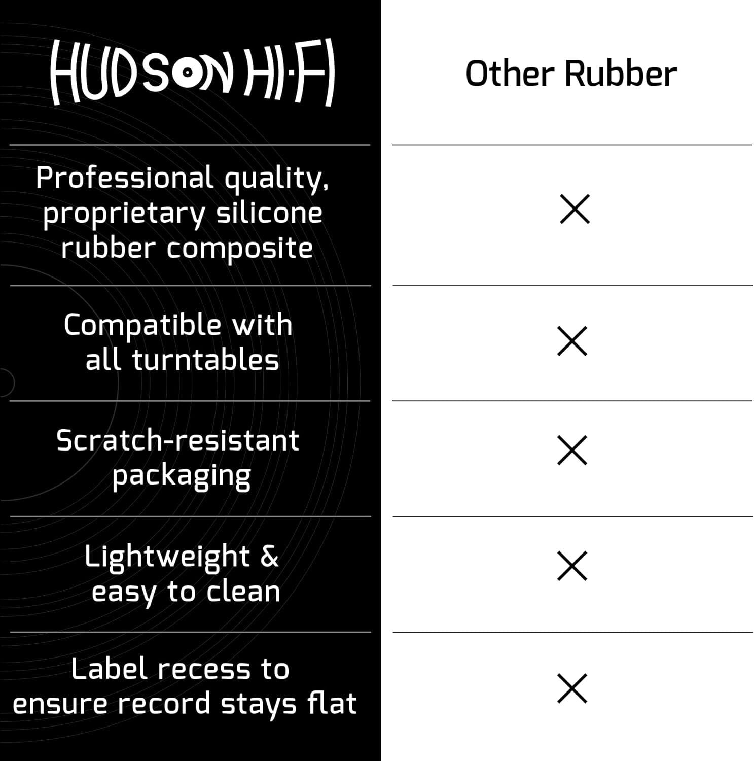 Designed to RIAA specifications in NY by Hudson Hi-Fi, incorporating non-slip grooves and label recess to ensure records stay flat on the mat for optimal playback.