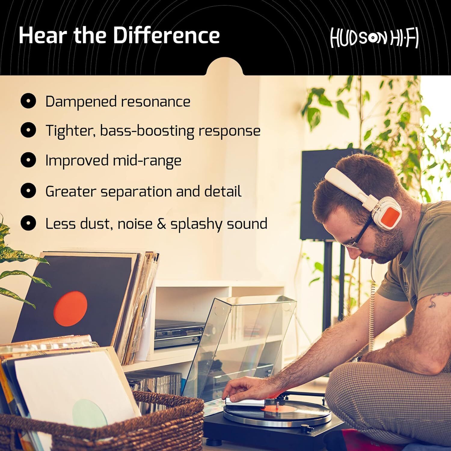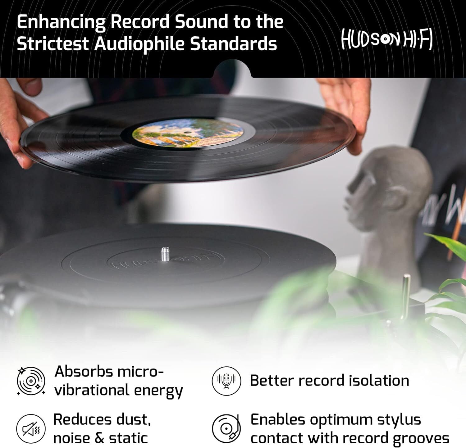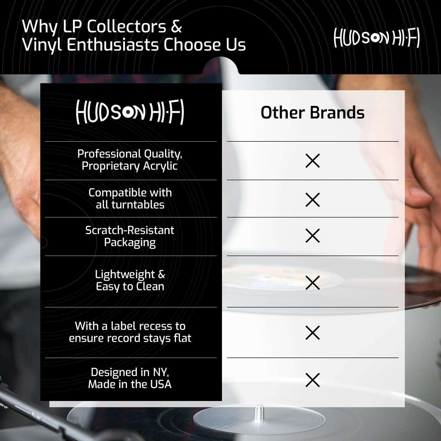 Designed to RIAA specifications in NY by Hudson Hi-Fi, incorporating non-slip grooves and label recess to ensure records stay flat on the mat for optimal playback.