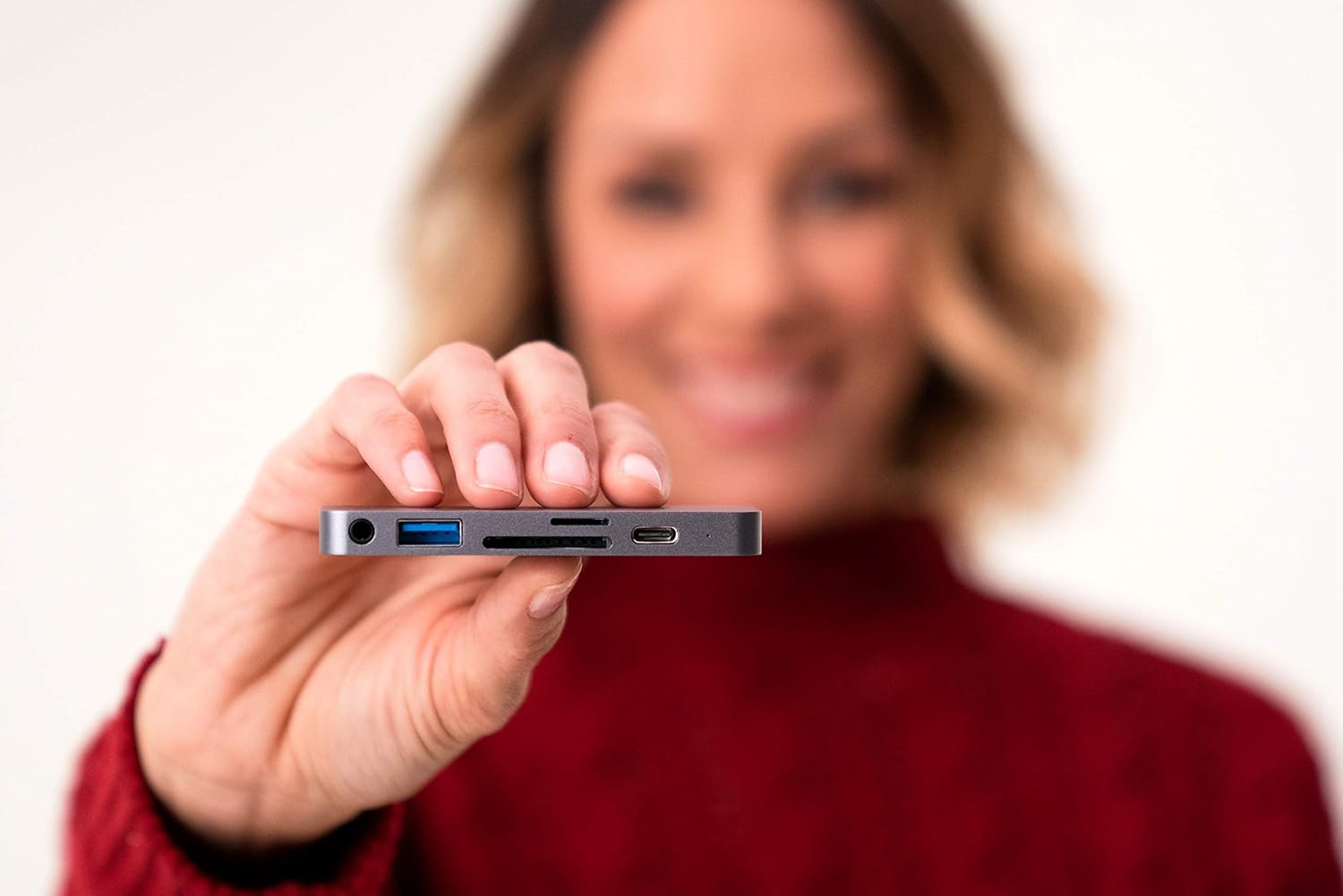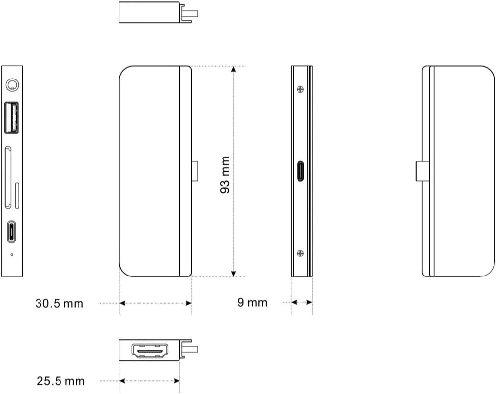 Turns a single USB-C connection into 6 ports (3.5mm Audio Jack, USB-A, SD, Micro SD, USB-C, HDMI).