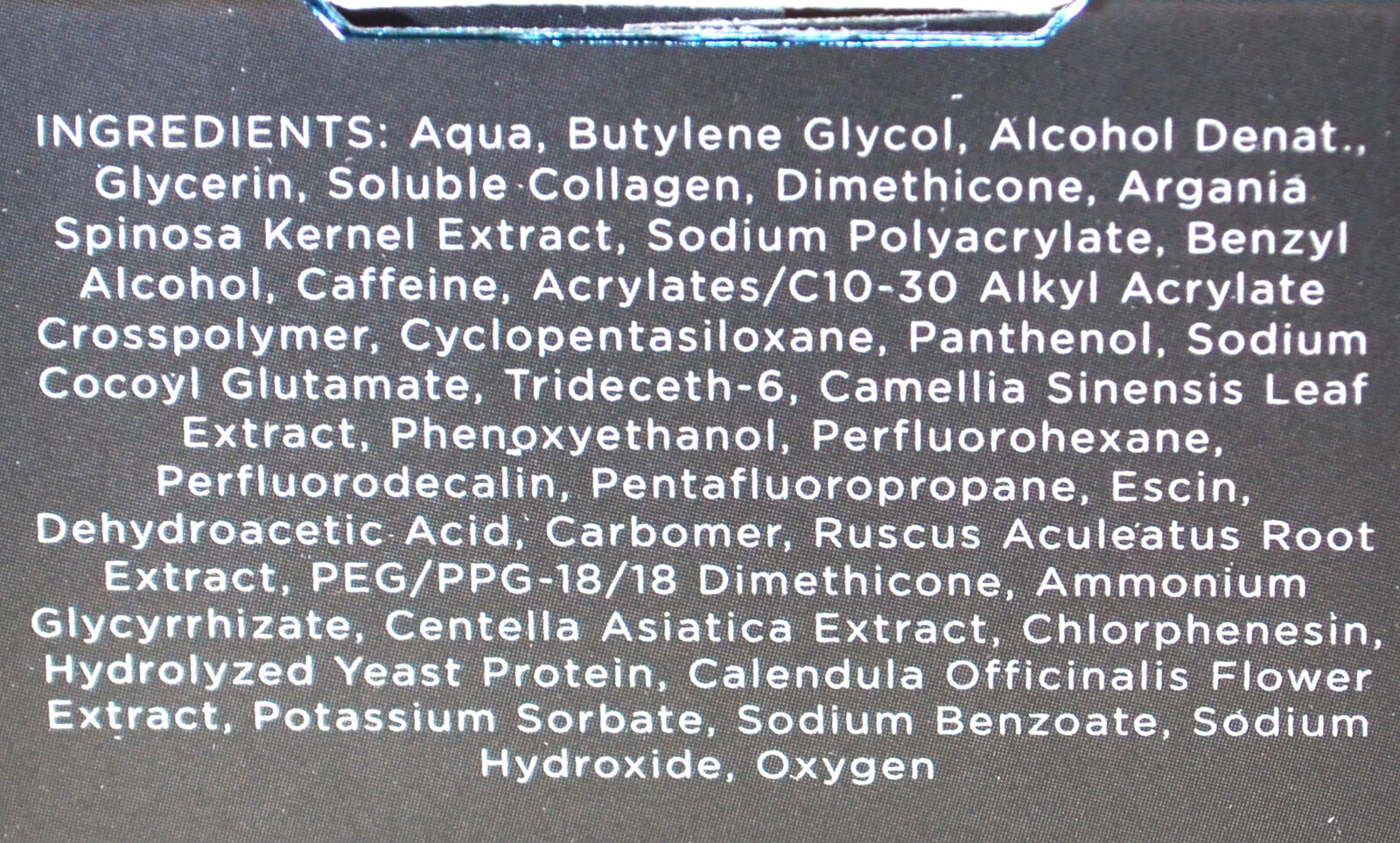 Aqua, Butylene Glycol, Alcohol Denat., Glycerin, Soluble Collagen, Dimethicone, Argania Spinosa Kernel Extract, Sodium Polyacrylate, Benzyl Alcohol, Caffeine, Acrylates/C10-30 Alkyl Acrylate Crosspolymer, Cyclopentasiloxane, Panthenol, Sodium Cocoyl Glutamate, Trideceth-6, Camellia Sinensis Leaf Extract, Phenoxyethanol, Perfluorohexane, Perfluorodecalin, Pentafluoropropane, Escin, Dehydroacetic Acid, Carbomer, Ruscus Aculeatus Root Extract, PEG/PPG-18/18 Dimethicone, Ammonium Glycyrrhizate, Centella Asiatica Extract, Chlorphenesin, Hydrolyzed Yeast Protein, Calendula Officinalis Flower Extract, Potassium Sorbate, Sodium Benzoate, Sodium Hydroxide, Oxygen