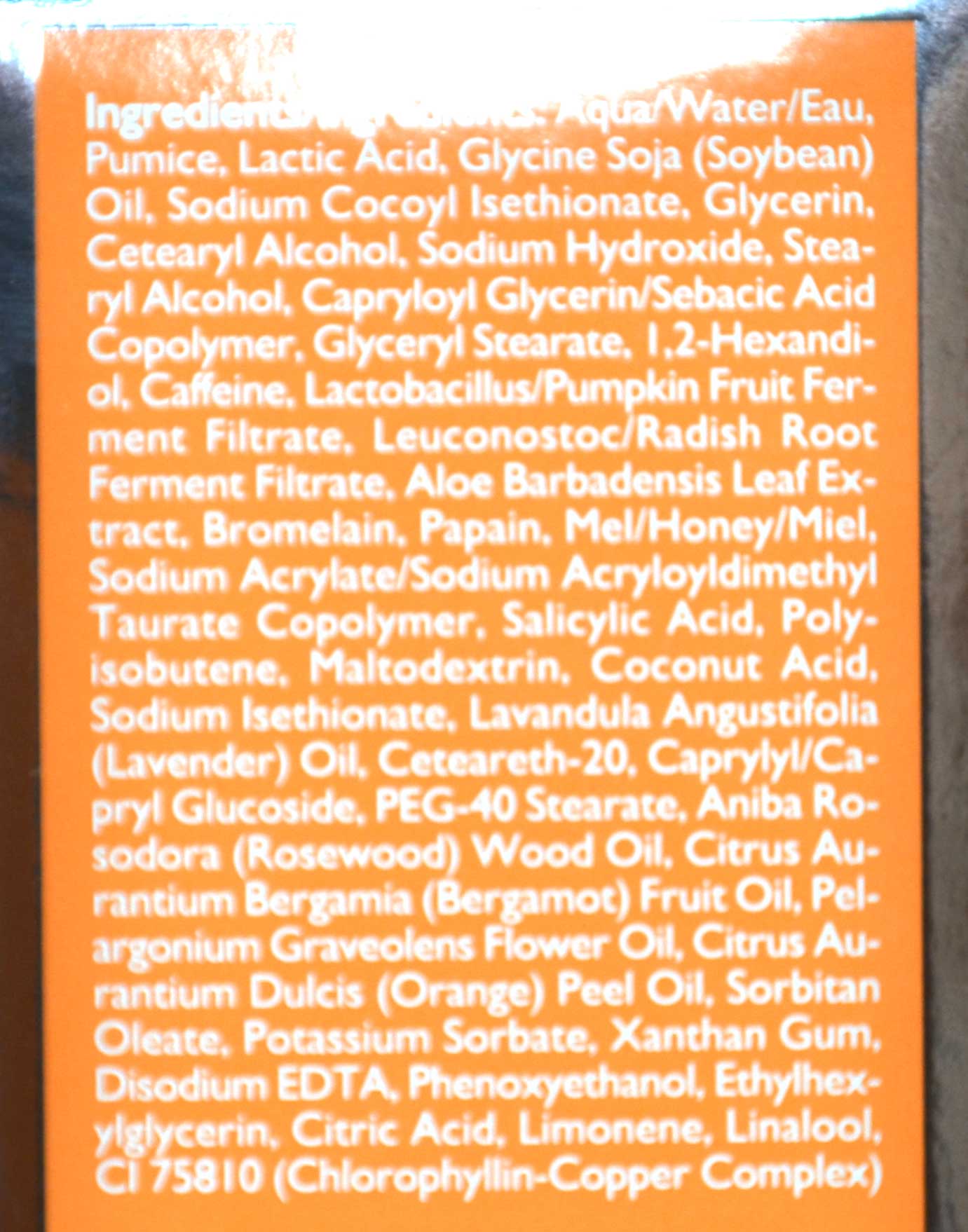 AQUA/WATER/EAU, LACTIC ACID, SILICA, GLYCINE SOJA (SOYBEAN) OIL, PECTIN, CETEARYL ALCOHOL, CARICA PAPAYA (PAPAYA) FRUIT, CETEARETH-20, CETYL ALCOHOL, PHENOXYETHANOL, DEHYDROXANTHAN GUM, GLYCERYL STEARATE, PEG-100 STEARATE, SALICYLIC ACID, LACTOBACILLUS/PUMPKIN FERMENT EXTRACT, ALCOHOL DENAT., SORBIC ACID, CINNAMAL, MEL/HONEY/MIEL, CITRUS AURANTIUM BERGAMIA (BERGAMOT) FRUIT OIL, EUGENOL, POTASSIUM SORBATE, LIMONENE, LINALOOL, LAVANDULA ANGUSTIFOLIA (LAVENDER) OIL, BETA-CAROTENE, ALOE BARBADENSIS LEAF JUICE POWDER, BROMELAIN, PAPAIN, RETINYL PALMITATE, TOCOPHERYL ACETATE, CINNAMOMUM CASSIA LEAF OIL, ACETIC ACID, POGOSTEMON CABLIN OIL, PELARGONIUM GRAVEOLENS FLOWER OIL, ANIBA ROSAEODORA (ROSEWOOD) WOOD EXTRACT, CITRUS AURANTIUM DULCIS (ORANGE) PEEL OIL, CI 75810 (CHLOROPHYLLIN-COPPER COMPLEX)