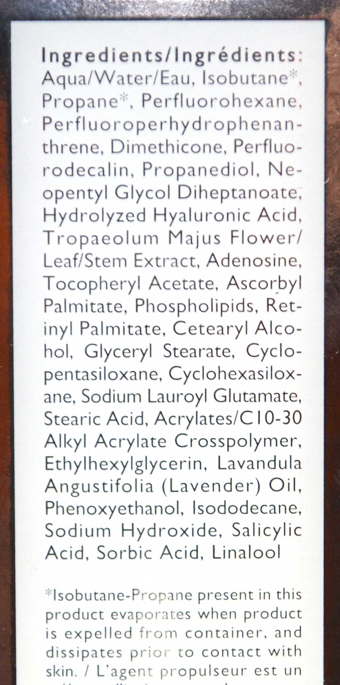 Aqua/Water/Eau, Isobutane*, Propane*, Perfluorohexane, Perfluoroperhydrophenanthrene, Dimethicone, Perfluorodecalin, Propanediol, Neopentyl Glycol Diheptanoate, Hydrolyzed Hyaluronic Acid, Tropaeolum Majus Flower/Leaf/Stem Extract, Adenosine, Tocopheryl Acetate, Ascorbyl Palmitate, Phospholipids, Retinyl Palmitate, Cetearyl Alcohol, Glyceryl Stearate, Cyclopentasiloxane, Cyclohexasiloxane, Sodium Lauroyl Glutamate, Stearic Acid, Acrylates/C10-30 Alkyl Acrylate Crosspolymer, Ethylhexylglycerin, Lavandula Angustifolia (Lavender) Oil, Phenoxyethanol, Isododecane, Sodium Hydroxide, Salicylic Acid, Sorbic Acid, Linalool.