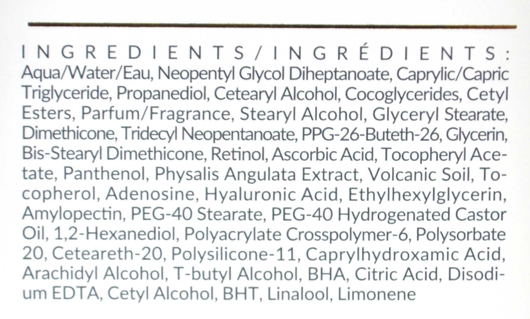 Aqua/Water/Eau, Neopentyl Glycol Diheptanoate, Caprylic/Capric Triglyceride, Propanediol, Cetearyl Alcohol, Cocoglycerides, Cetyl Esters, Parfum/Fragrance, Stearyl Alcohol, Glyceryl Stearate, Dimethicone, Tridecyl Neopentanoate, PPG-26-Buteth-26, Glycerin, Bis-Stearyl Dimethicone, Retinol, Ascorbic Acid, Tocopheryl Acetate, Panthenol, Physalis Angulata Extract, Volcanic Soil, Tocopherol, Adenosine, Hyaluronic Acid, Ethylhexylglycerin, Amylopectin, PEG-40 Stearate, PEG-40 Hydrogenated Castor Oil, 1,2-Hexanediol, Polyacrylate Crosspolymer-6, Polysorbate 20, Ceteareth-20, Polysilicone-11, Caprylhydroxamic Acid, Arachidyl Alcohol, T-butyl Alcohol, BHA, Citric Acid, Disodium EDTA, Cetyl Alcohol, BHT, Linalool, Limonene.