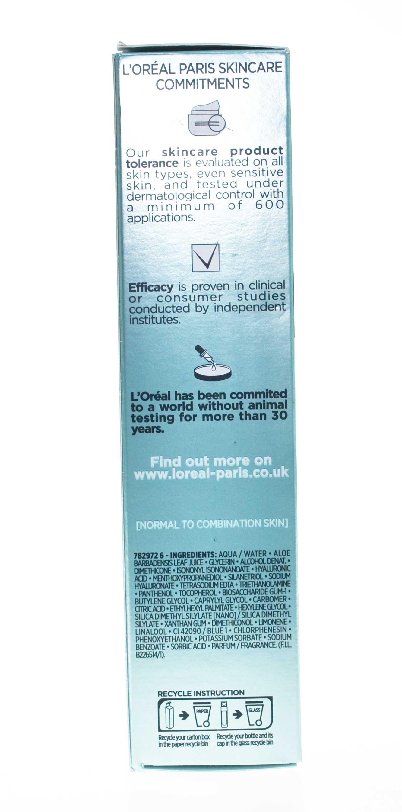 782972 6, Aqua / Water, Aloe barbadensis Leaf Juice, Glycerin, Alcohol Denat Dimethicone, Isononyl Isononanoate, , Hyaluronic Acid, Menthoxypropanediol, Silanetriol, Sodium Hyaluronate, Tetrasodium EDTA, Triethanolamine, Panthenol, Tocopherol, Biosaccharide Gum-1, Butylene Glycol, Caprylyl Glycol, Carbomer, Citric Acid, Ethylhexyl Palmitate, Hexylene Glycol, Silica Dimetal Silylate / Silica Dimethyl Silylate [Nano], Xanthan Gum, Dimethiconol, Limonene, Linalool, CI 42090 / Blue 1, Chlorphenesin, Phenoxyethanol, Potassium Sorbate, Sodium Benzoate, Sorbic Acid, Parfum / Fragrance (F.I.L. B226514/1)