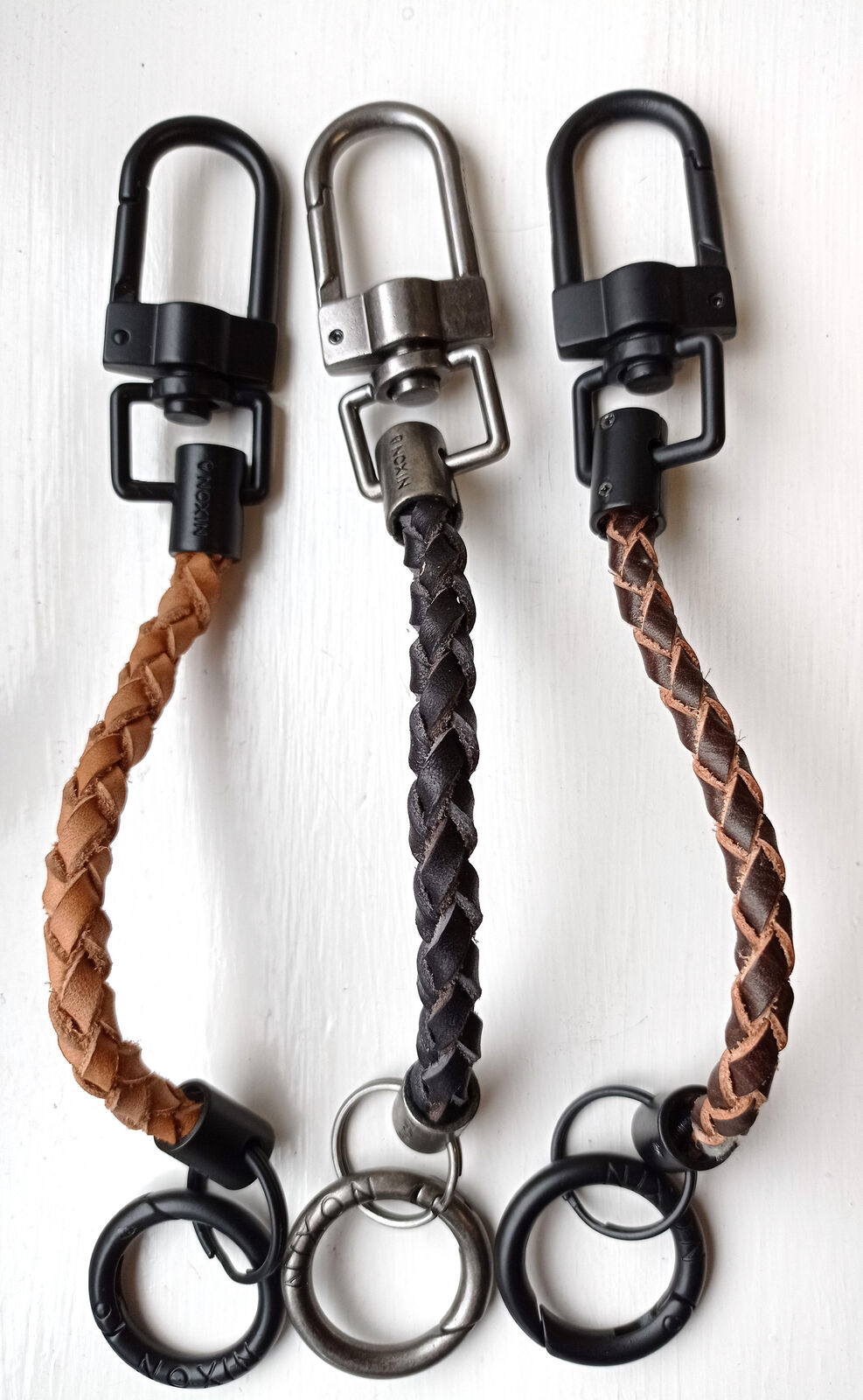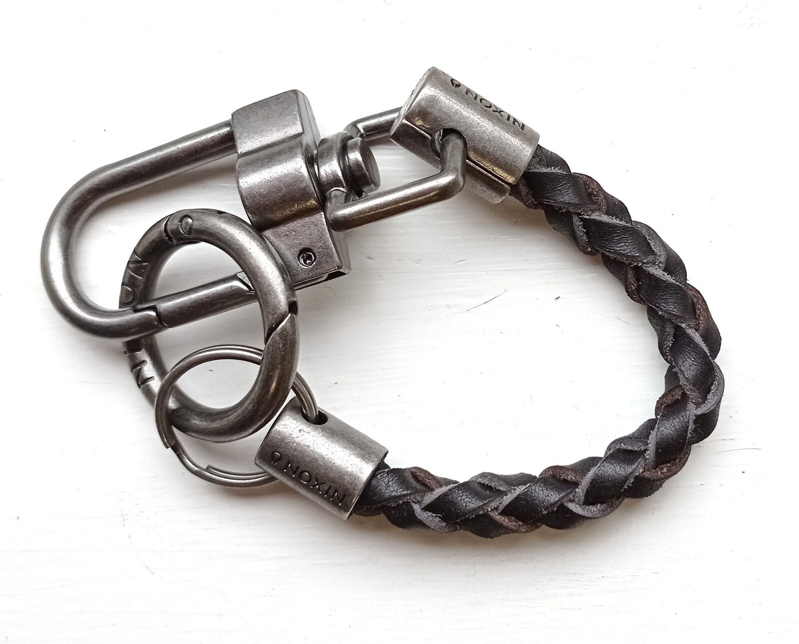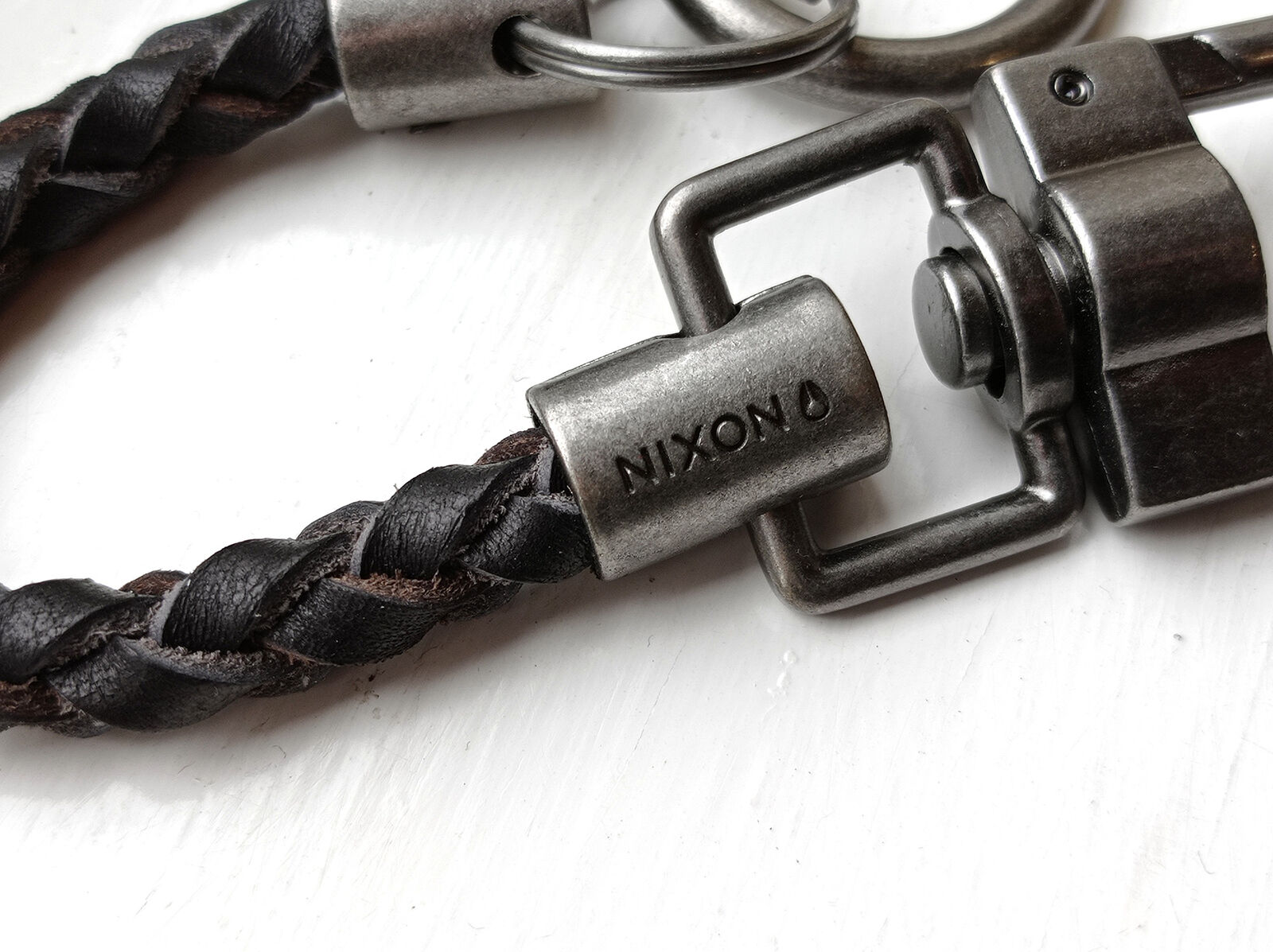 Real leather platted chain with carabiner at one end and Nixon branded key ring at the other