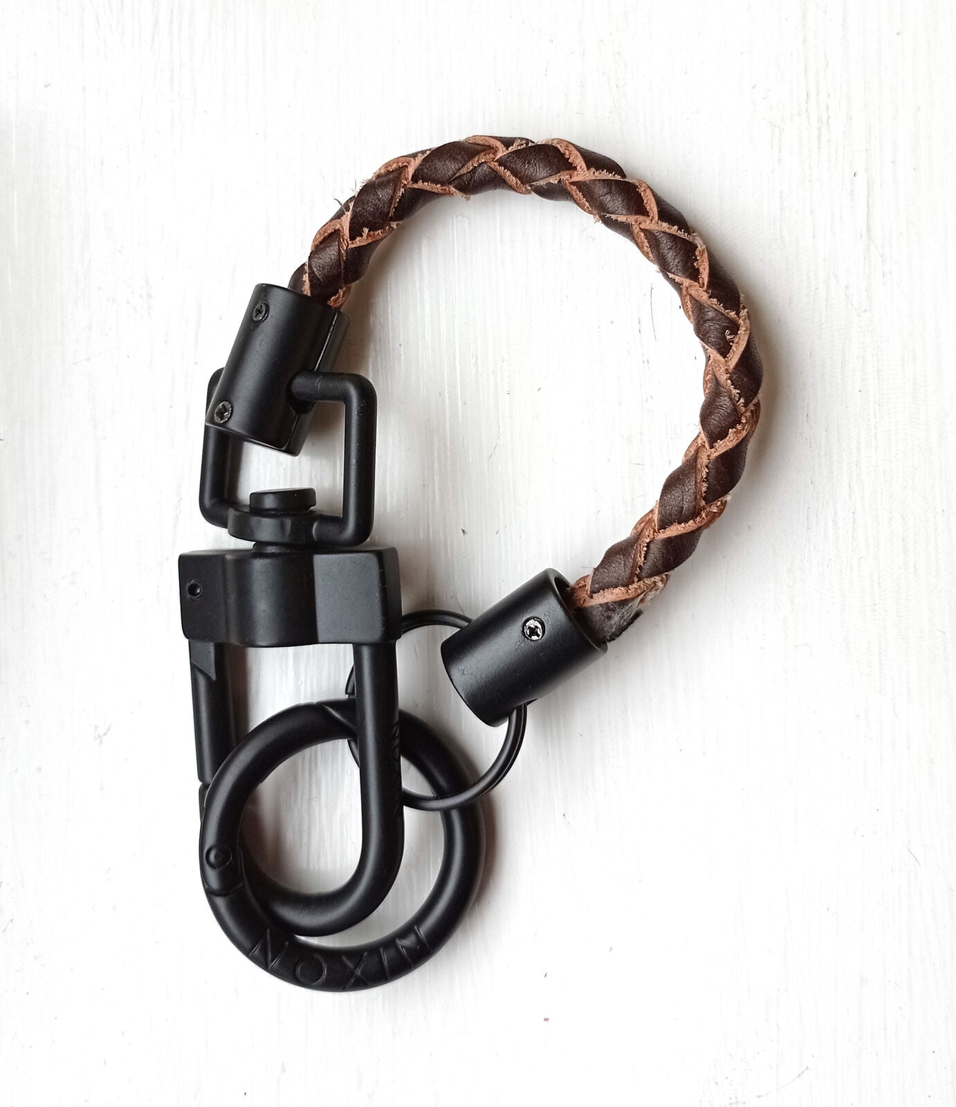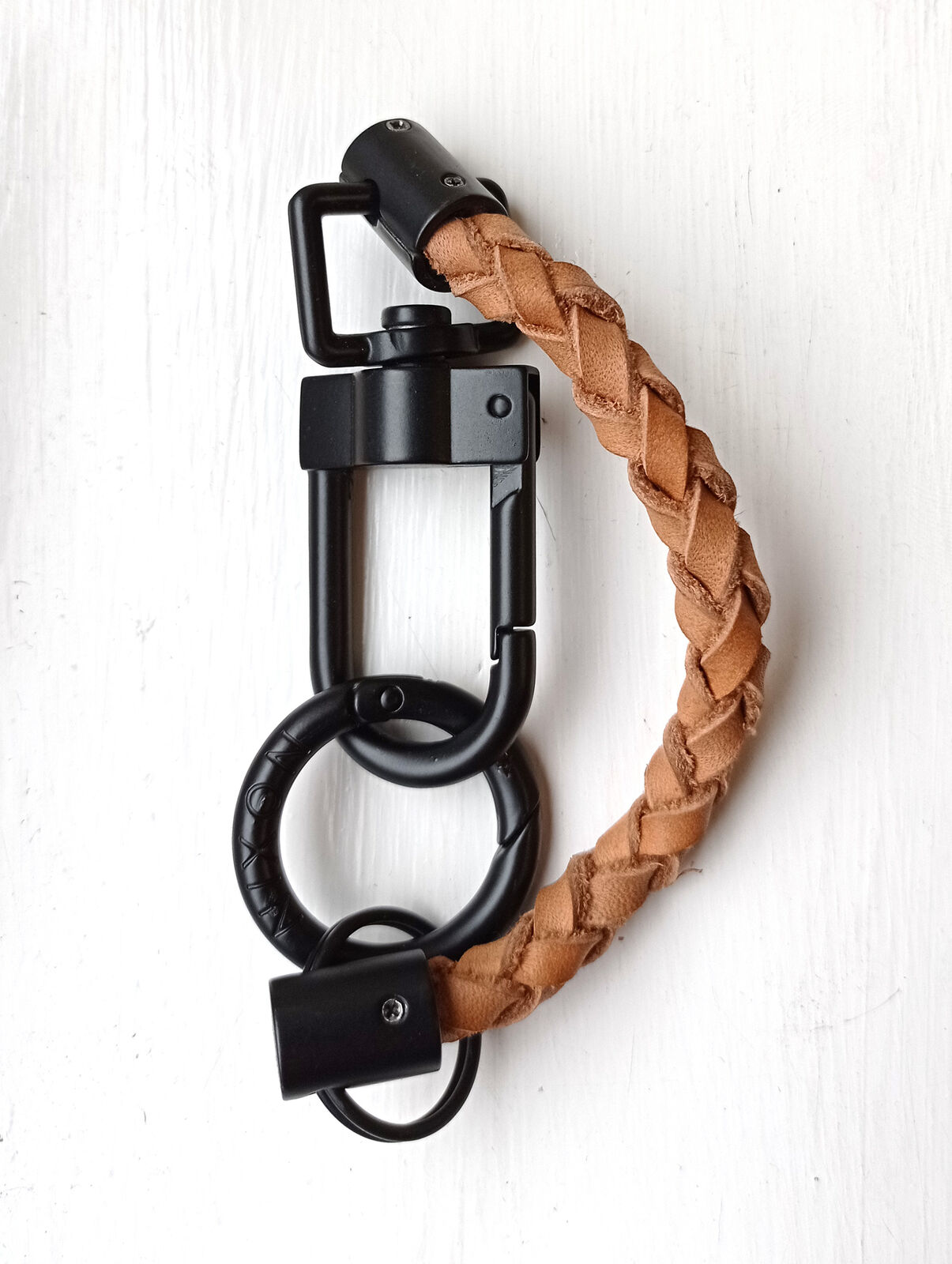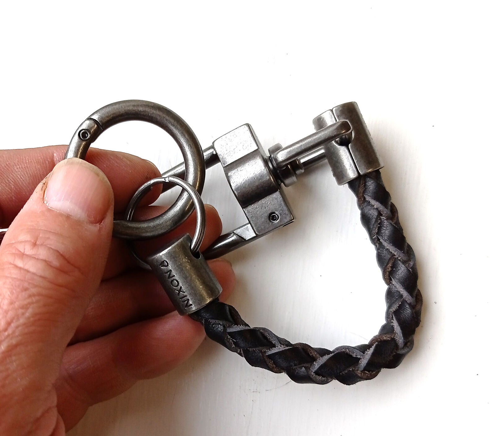Real leather platted chain with carabiner at one end and Nixon branded key ring at the other