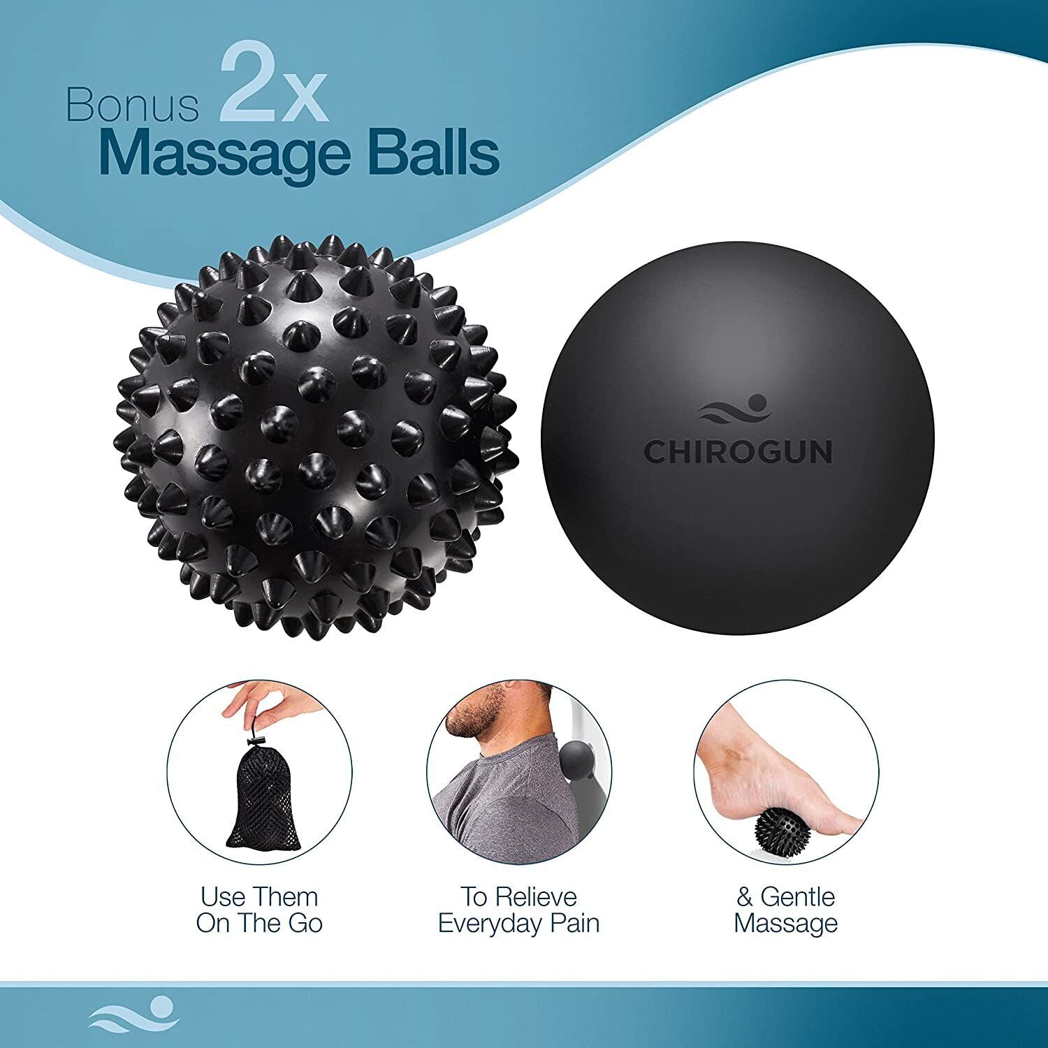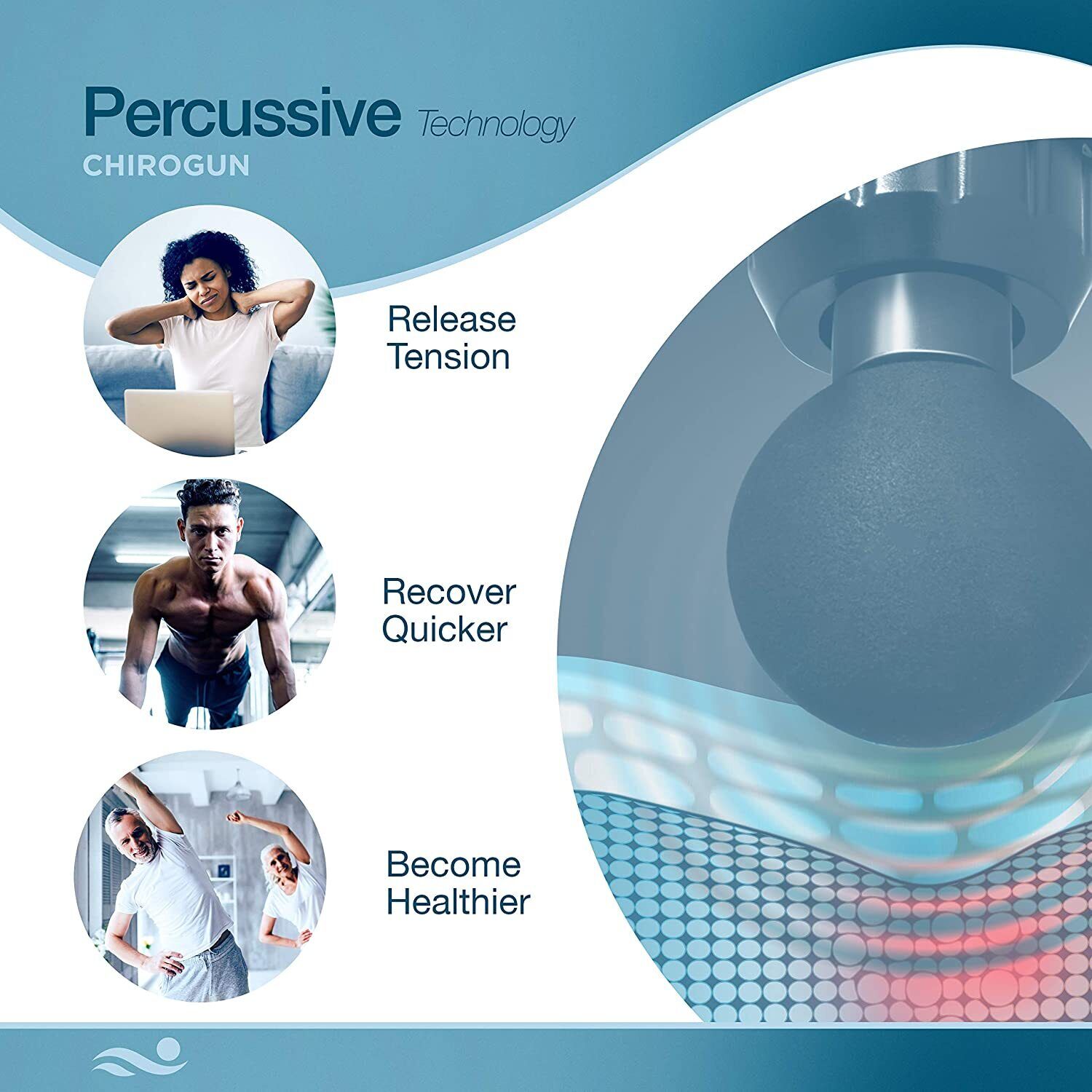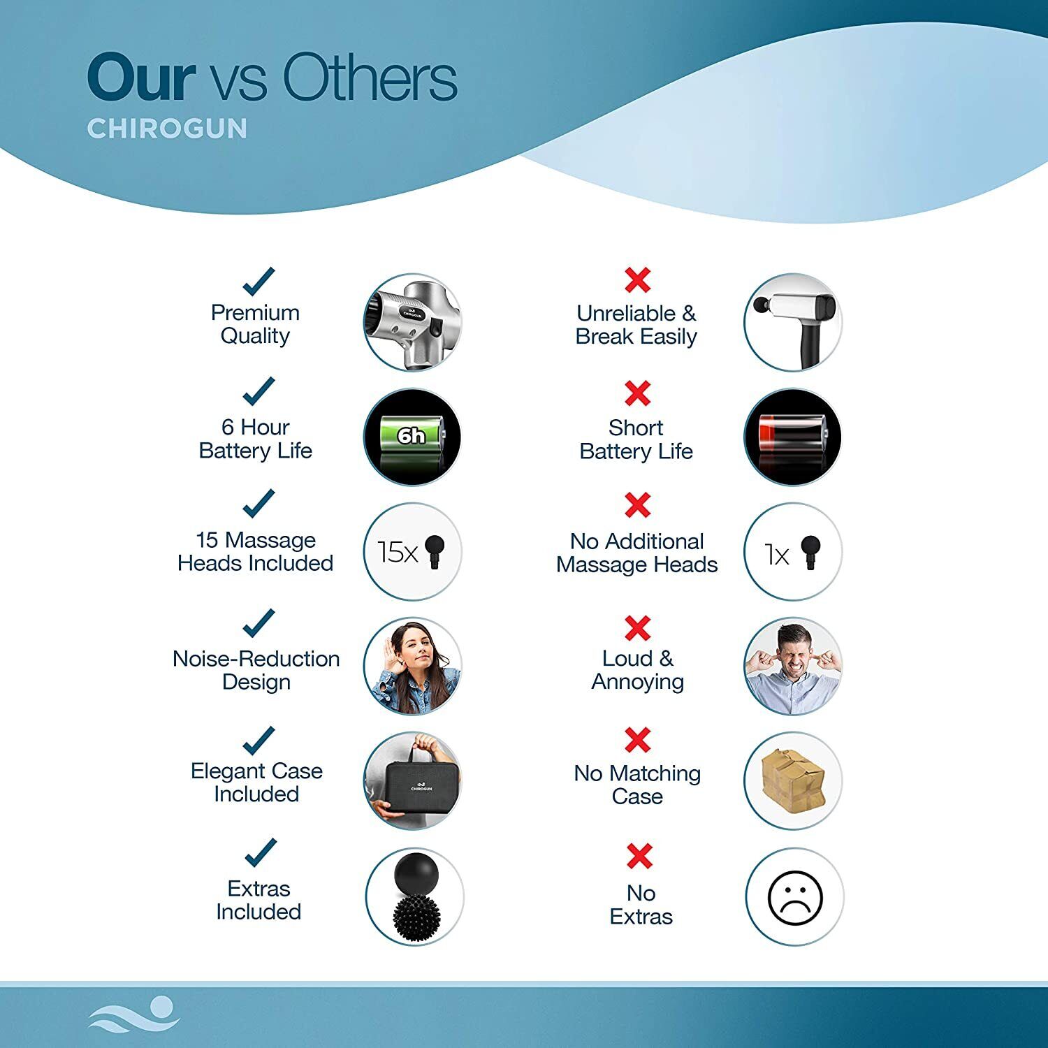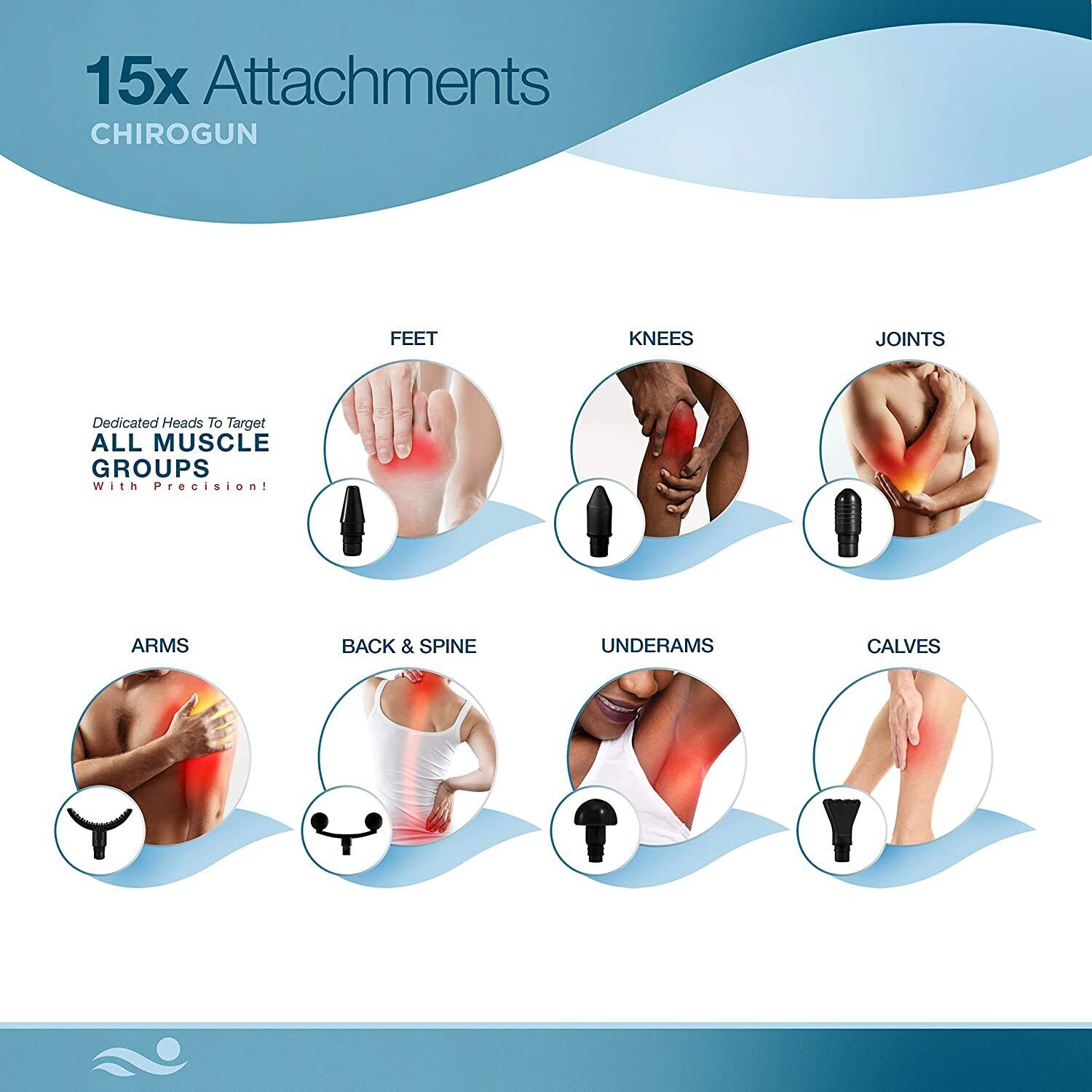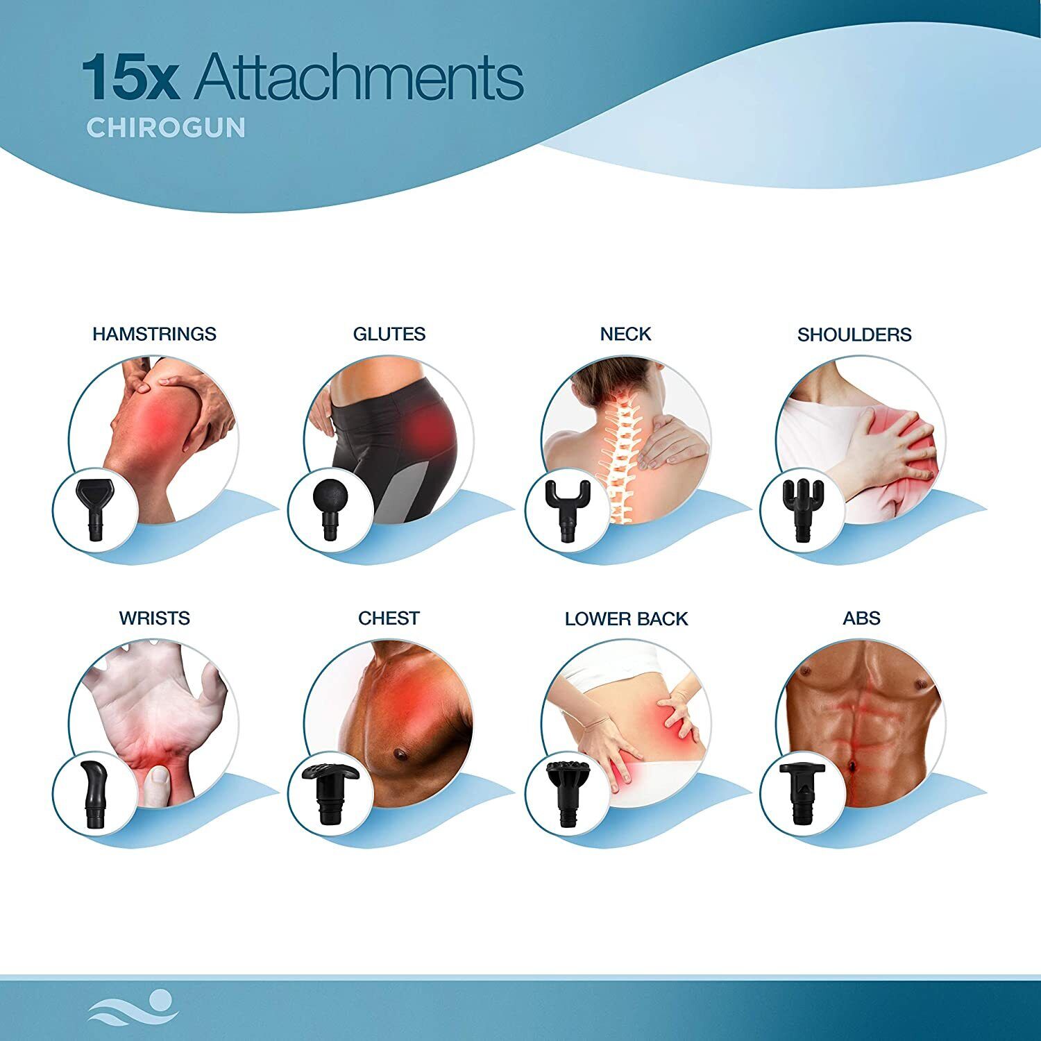 15 Heads and 2 Bonus massage balls included - the Chirogun percussion massager includes a market leading 15 head attachments, a tool included for massaging every muscle in your body promoting circulation and helping to accelerate both warm-up and recovery. Plus, the set includes a case simplifying storage and transportation.