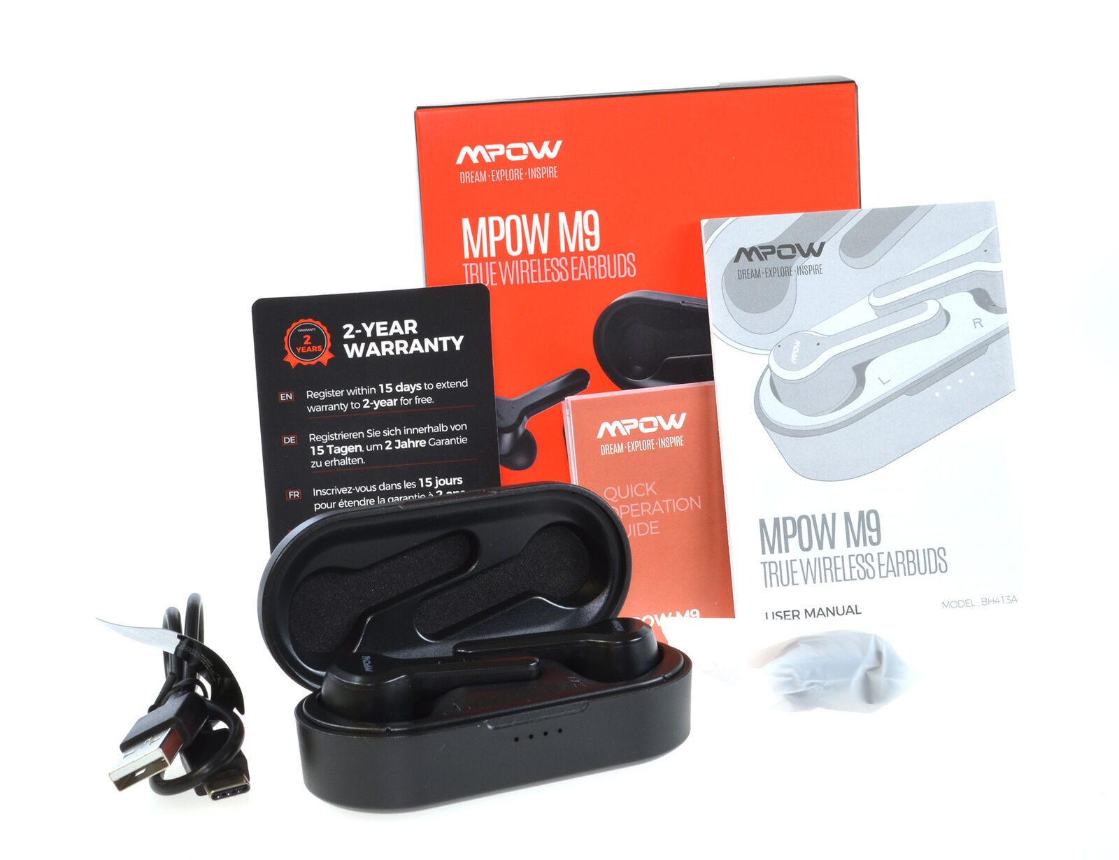 Upgraded Extended 40H Playtime & USB-C Charge Support:Mpow M9 true wireless earbuds provide up to 6 hours of playback or talk time on one charge, 200 hours of standby time, extra 34 hours of listening time with USB-C charging case. Total up to 40 hrs of playtime. Earbuds absorb power automatically when they are put back into the charging case. Quick Charge: It takes only 90 minutes to charge the earbuds from 0% to 100%.