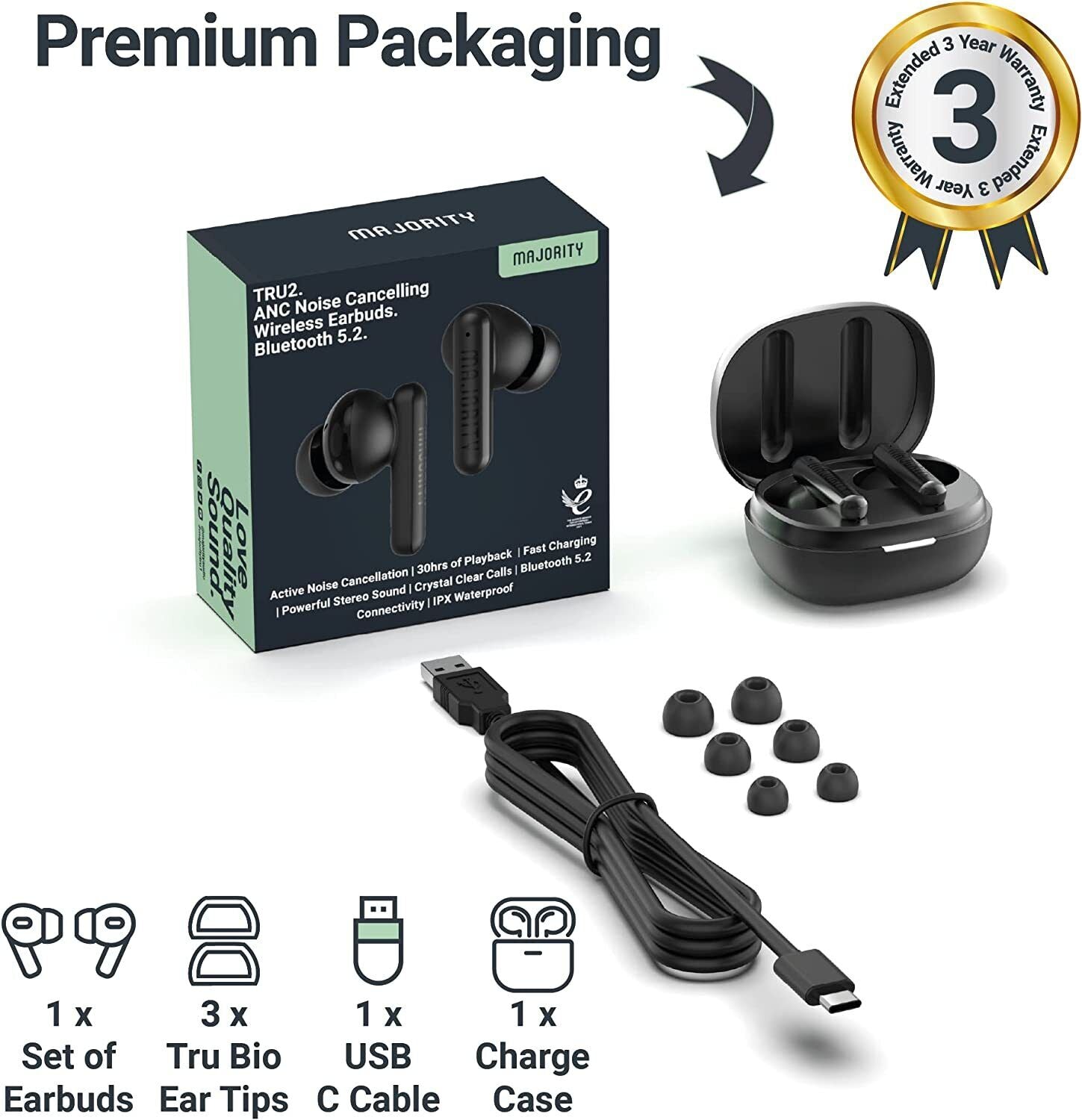 True Wireless Earphones Majority TRU2 3 Tips ANC USB-C 30 Hours 5.2Bluetooth