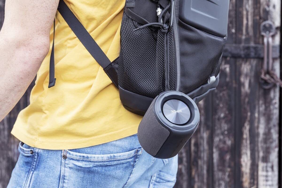 Follow the Music From now on, the party is wherever you are. The Trust Caro Compact is a small Bluetooth speaker that packs quite a punch. It has an IPX7 certification, so its waterproof, and has a rechargeable battery that will last for up to 14 hours. So take the party with you where ever you go, the Caro Compact will be your travel buddy.